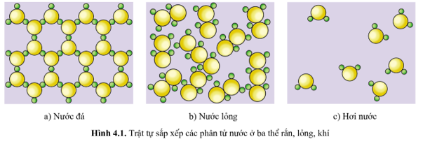 Hình 4.1 mô tả trật tự sắp xếp của các phân tử nước ở ba thể: rắn, lỏng và khí.