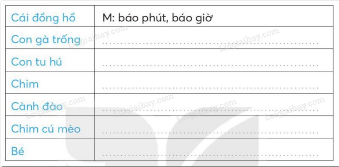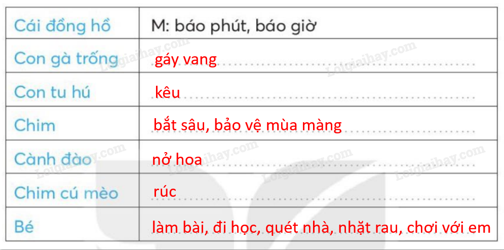 Cái đồng hồ tích tắc, tích tắc, bảo phút, bảo giờ. Con gà trống gáy vang ò ó o, bảo cho mọi người biết trời sắp sáng, mau mau thức dậy. Con tu hú kêu tu hủ, tu hú. Thế là sắp đến mùa vải chín. Chim bắt sâu, bảo vệ mùa màng. Cành đào nở hoa cho Sắc xuân thêm rực rỡ, ngày xuân thêm tưng bừng. Chim cú mèo chập tối đứng trong hốc cây rúc củ có cũng làm việc có ích cho đồng ruộng.