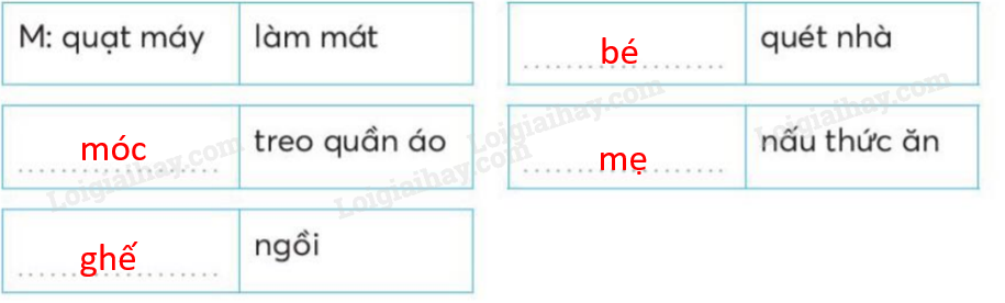 Em dựa vào từ ngữ chỉ công dụng của đồ vật, hoạt động của con người ở cột bên phải để tìm những từ chỉ sự vật thích hợp và điền vào chỗ trống.