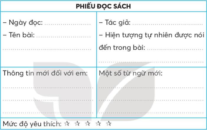 Đọc bài văn, bài thơ,... về hiện tượng tự nhiên (nắng, mưa, gió,...) và viết thông tin vào phiếu đọc sách.