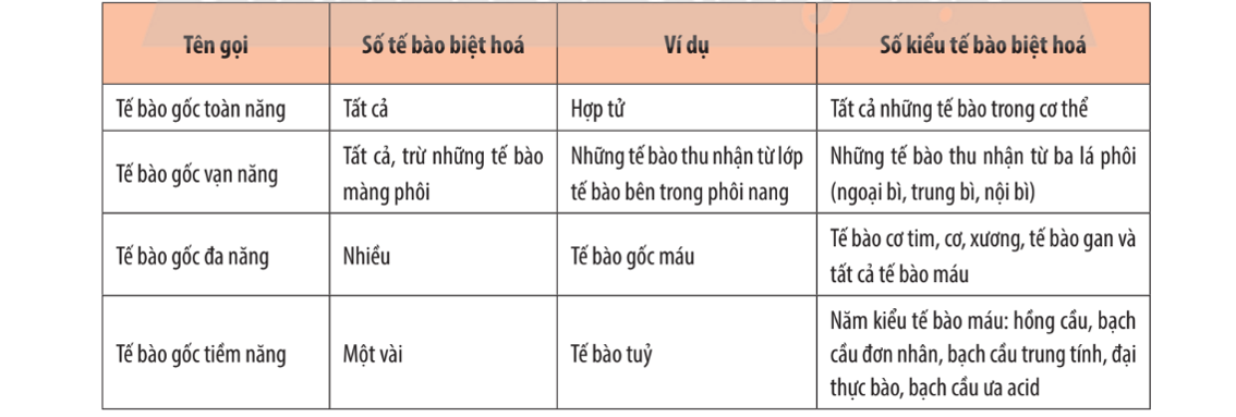 a) Loại tế bào gốc nào có tiềm năng biệt hóa lớn nhất?