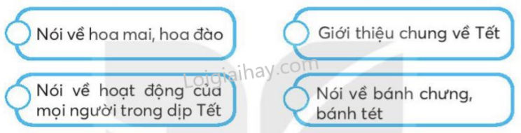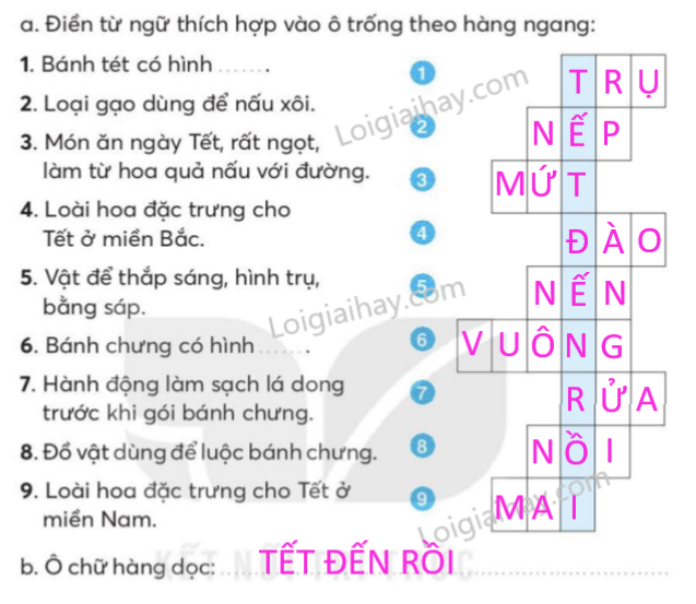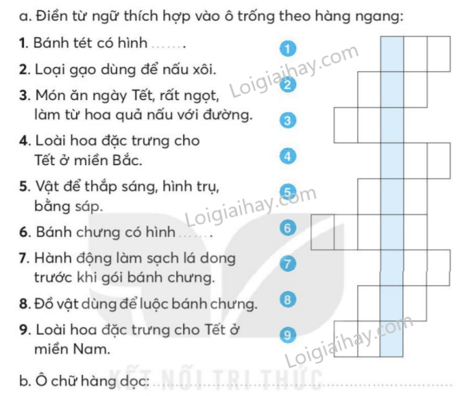 Sắp xếp các ý dưới đây theo trình tự các đoạn trong bài đọc. Tìm trong bài những từ ngữ miêu tả. Viết một câu giới thiệu về loài hoa em thích. Giải ô chữ. Điền g hoặc gh vào chỗ trống. Chọn a hoặc b. Quan sát các tranh và điền vào bảng ở dưới. Viết một câu hỏi và một câu trả lời về việc em thường làm trong dịp Tết. Em hãy viết và trang trí một tấm thiệp chúc Tết gửi cho một người bạn hoặc người thân ở xa.
