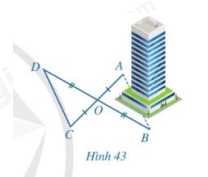 Để đo khoảng cách giữa hai vị trí A, B ở hai phía của một tòa nhà mà không thể đo trực tiếp được, người ta làm như sau: Chọn các vị trí O, C, D sao cho O không thuộc đường thẳng AB; khoảng cách CD là đo được; O là trung điểm của cả AC và BD (hình 43). Người ta đo được CD = 100 m và khẳng định AB = 100 m. Em hãy giải thích vì sao AB = 100m.