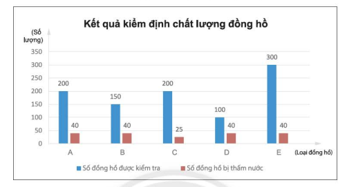 Từ biểu đồ cột kép trên, hãy tính tỉ số giữa số đồng hồ bị thấm nước và số đồng hồ đem kiểm tra của mỗi loại đồng hồ và dự đoán loại đồng hồ nào chống thấm nước tốt nhất.