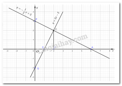Vì C là hoành độ giao điểm của hai đường thẳng \(y = - \dfrac{1}{2}x + 3\) và y = 2x – 2 nên C(2; 2)