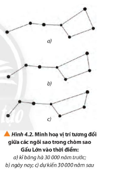 Tại sao khi quan sát bầu trời sao vào các thời điểm khác nhau tại cùng một địa điểm trên Trái Đất, ta sẽ thấy vị trí tương đối giữa các sao khác nhau (Hình 4.2)