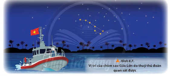 Sau một trận bão, toàn bộ thiết bị định vị và liên lạc trên một chiếc tàu thám hiểm bị hư hỏng, tàu bị mất phương hướng trên biển. Thủy thủ đoàn quan sát bầu trời đêm và vẽ được chòm sao Gấu Lớn như Hình 4.7. Em hãy giúp họ xác định phương hướng bằng cách chỉ ra vị trí của sao Bắc Cực.