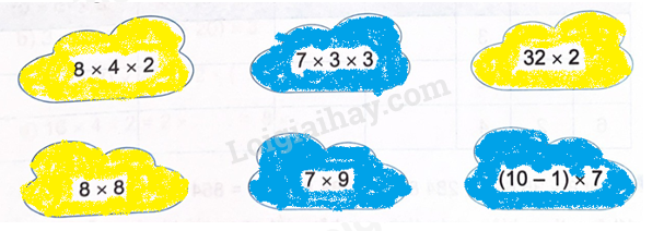 Tô cùng màu các đám mây ghi biểu thức có giá trị bằng nhau.
