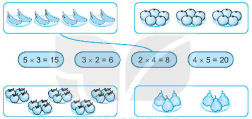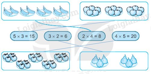 Quan sát tranh rồi nối các hình với phép nhân có kết quả là số quả trong hình đó.
