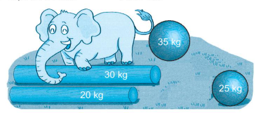 Bạn voi muốn kéo một khúc gỗ dạng khối cầu và một khối gỗ dạng khối trụ có tổng cân nặng bé nhất. Bạn ấy đã kéo 45 kg gỗ.