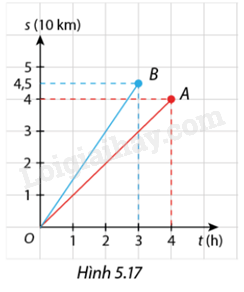 Bình và An cùng đi xe đạp xuất phát từ cùng một địa điểm với tốc độ không đổi. Trong Hình 5.17, đoạn thẳng \(OA\) là đồ thị quãng đường – thời gian của An và đoạn thẳng \(OB\) là đồ thị quãng đường – thời gian của Bình. Mỗi đơn vị trên trục \(Ot\) biểu thị 1 giờ, mỗi đơn vị trên trục \(Os\) biểu thị 10 km. Dựa vào đồ thị, hãy cho biết: