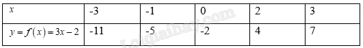 Thay các giá trị \(x = - 2,x = 1,x = \frac{1}{2}\) vào hàm số \(y = f\left( x \right) = 3x - 2\). Sau đó xác định các giá trị của hàm số tương ứng với mỗi giá trị của biến số trong Bảng 5.11.