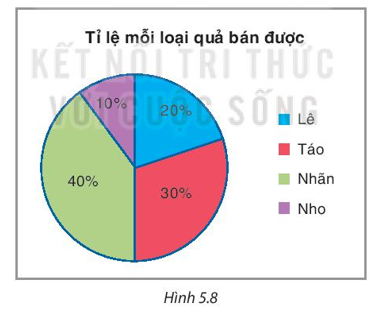 Biểu đồ Hình 5.8 cho biết tỉ lệ mỗi loại quả bán được của một cửa hàng. Giả sử cửa hàng bán được 200 kg quả các loại. Lập bảng thống kê cho biết số lượng mỗi loại quả cửa hàng bán được. Vẽ biểu đồ cột biểu diễn bảng thống kê này.