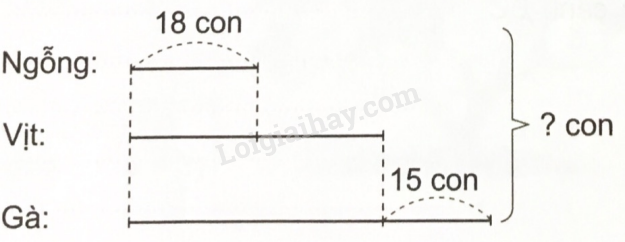 Đề bài: Một trang trại có 16 con ngỗng, số con vịt nhiều gấp đôi số con ngỗng, số con gà nhiều hơn số con vịt là 15 con. Hỏi trang trại đó có tất cả bao nhiêu con?
