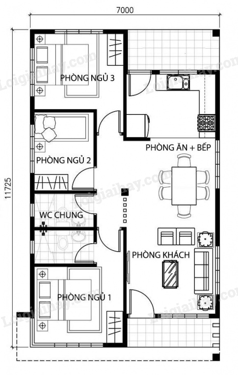 - 1 phòng khách + phòng bếp, 1 nhà vệ sinh, 2 phòng ngủ