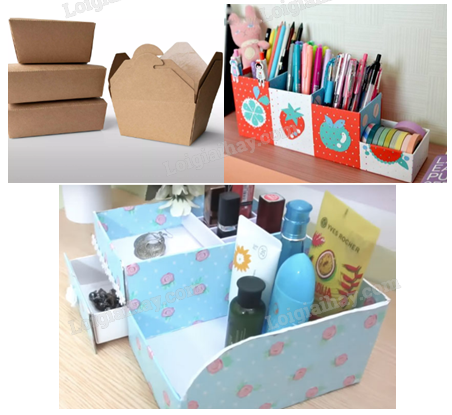 - Công năng sử dụng của hộp giấy: dùng để đựng đồ ăn, đựng đồ dùng, làm hộp quà, làm hộp trang trí.