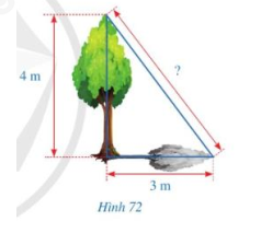 Hình 72 mô tả một cây cao 4m. Biết rằng khi trời nắng, cây đổ bóng trên mặt đất, điểm xa nhất của bóng cây cách gốc cây một khoảng là 3 m. Tính khoảng cách từ điểm xa nhất của bóng cây đến đỉnh của cây.