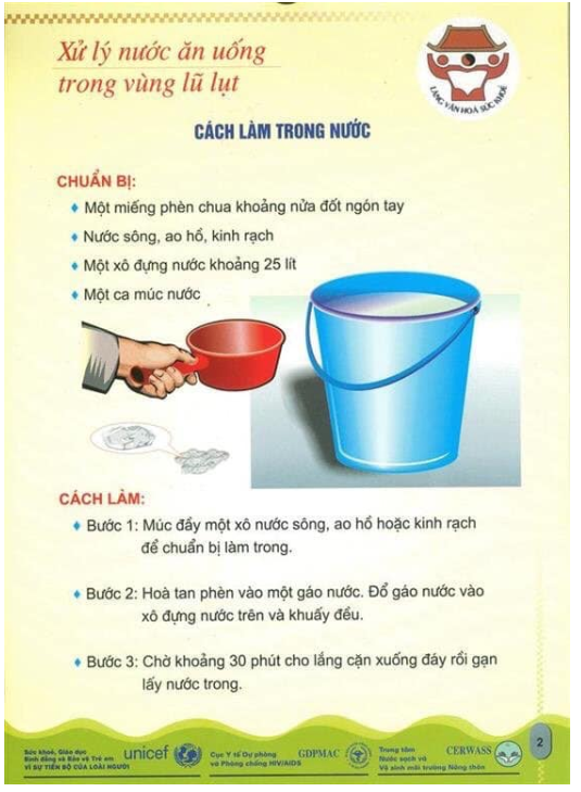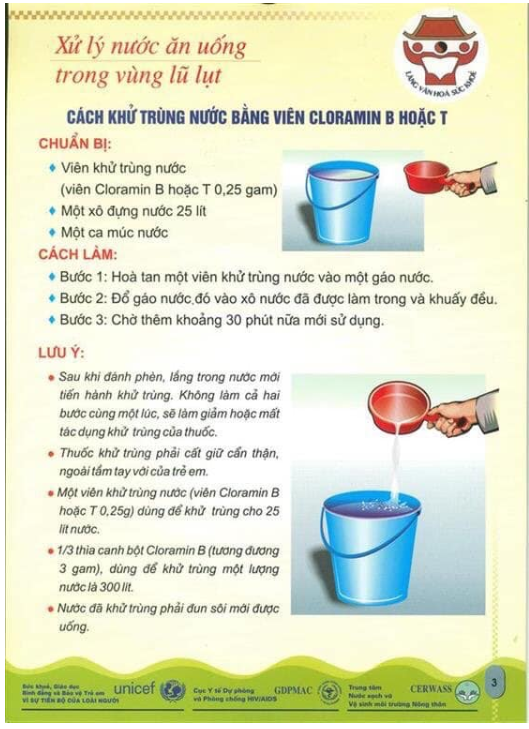 Sau mưa lũ, lụt, những vùng bị thiên tai có nguồn nước nhiễm bẩn do rác thải, bùn đất, xác động thực vật phân huỷ, ... ảnh hưởng trực tiếp đến đời sống của người dân. Hãy thiết kế poster hướng dẫn mọi người cách xử lí để có nước sinh hoạt an toàn, bảo đảm sức khoẻ và phòng tránh dịch bệnh có thể xảy ra.
