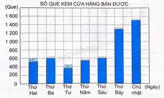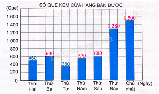 Cho dãy số liệu về số que kem cửa hàng đã bán được từ thứ Hai đến Chủ nhật tuần vừa qua: 460 que, 600 que, 380 que, 570 que, 600 que, 1 280 que, 1 500 que.