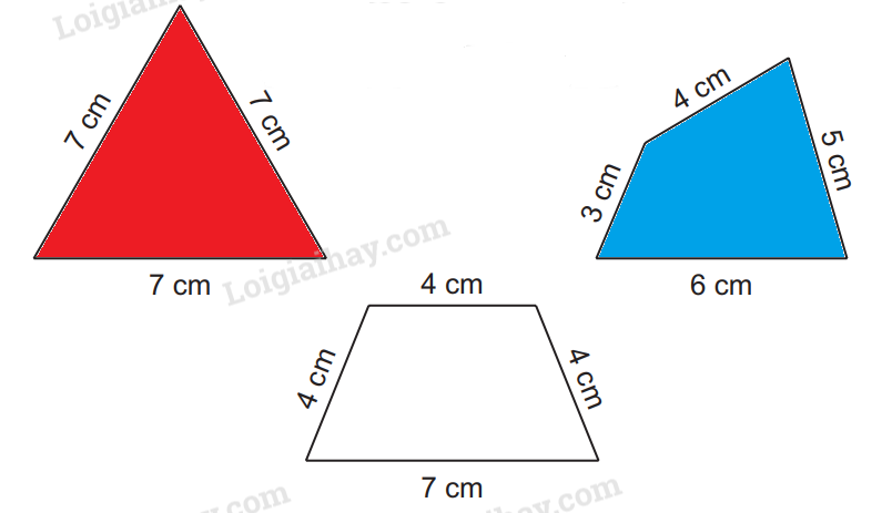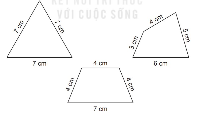 Tính chu vi hình tam giác có độ dài các cạnh là 4 cm, 7 cm và 10 cm. Tính chu vi hình tứ giác có độ dài các cạnh là 20 dm, 30 dm, 20 dm và 30 dm.