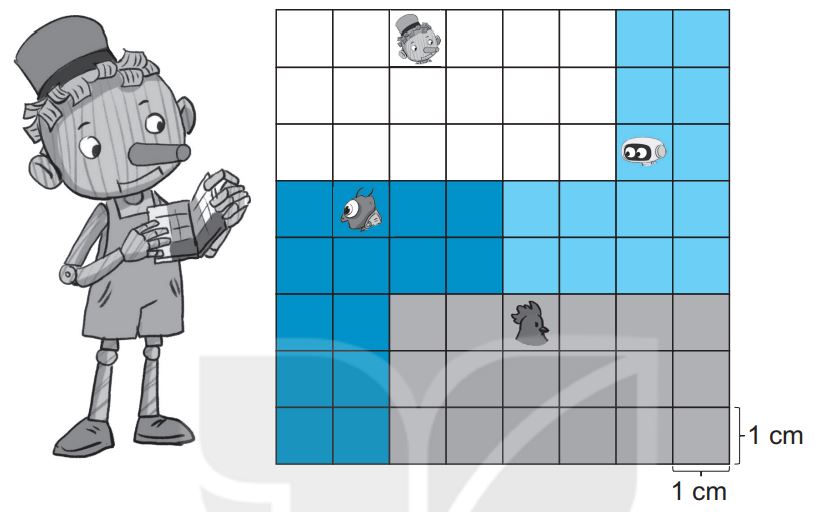 Dế mèn : ..... cm2, rô-bốt: ..... cm2, gà: ..... cm2, Bu-ra-ti-nô: ..... cm2.
