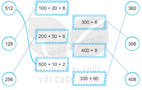 Nối mỗi số với tổng các trăm, chục, đơn vị thích hợp.