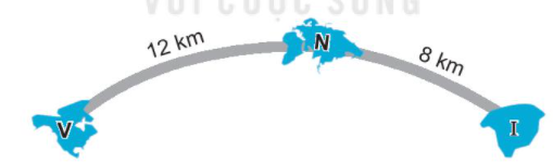 Có 3 hòn đảo V, N, I ở vị trí như hình vẽ. Một cây cầu dài 12 km nối đảo V với đảo N và một cây cầu dài 8 km nối đảo N với đảo I.