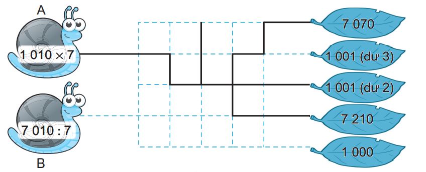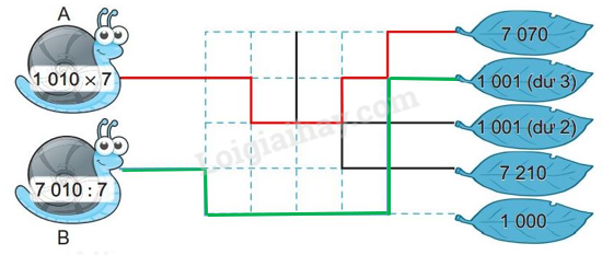 Chú Ốc sên A chỉ bò theo đường nét liền. Chú ốc sên B chỉ bò theo đường nét đứt. Cả hai chú ốc sên đều bò đến chiếc lá ghi kết quả của phép tính trên mình chú ốc sên đó. Em hãy tô màu đỏ cho đường đi của ốc sên A và màu xanh cho đường đi của ốc sên B.