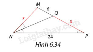 \(\frac{{MQ}}{{QP}} = \frac{{NM}}{{NP}} \Leftrightarrow \frac{6}{x} = \frac{x}{{24}} \Leftrightarrow {x^2} = 144 \Rightarrow x = 12\)