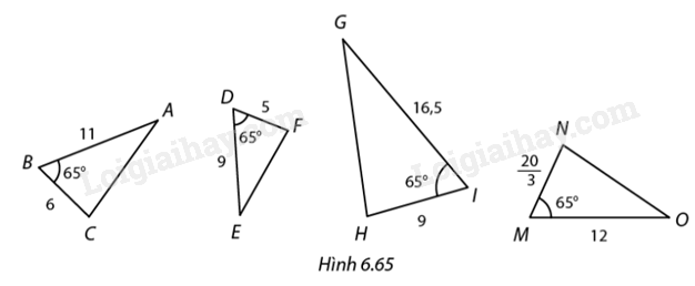 Xác định các cặp tam giác đồng dạnh với nhau trong Hình 6.65. Cho biết kí hiệu của sự đồng dạng và xác định tỉ số đồng dạng trong mỗi trường hợp.