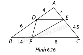 \(\begin{array}{l}\frac{{DA}}{{DB}} = \frac{4}{6} = \frac{2}{3}\\\frac{{EA}}{{EC}} = \frac{3}{{4,5}} = \frac{2}{3}\\ = > \frac{{DA}}{{DB}} = \frac{{EA}}{{EC}} = \frac{2}{3}\end{array}\)