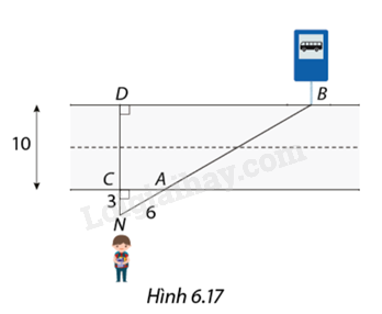 Trong Hình 6.17, mặt đường rộng \(10\,m\) và hai lề đường song song với nhau. Vị trí Nam đứng trên vỉa hè (điểm \(N),\) điểm \(A\) và vị trí trạm xe buýt bên kia đường (điểm \(B)\) thẳng hàng. Biết Nam đứng cách đường \(3\,m,\) khoẳng cách \(AN = 6m.\) Tìm khoảng cách \(BN\) giữa Nam và trạm xe buýt.