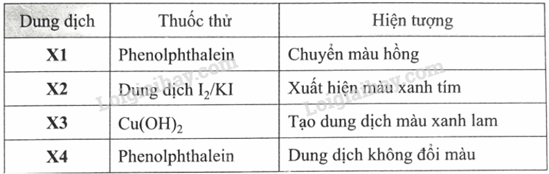X2 tác dụng với dung dịch I2/KI có hiện tượng xuất hiện màu xanh tím → X2 là hồ tinh bột.