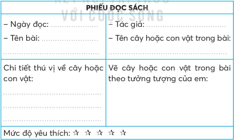 Đọc bài Tiếng vườn hoặc tìm đọc câu chuyện, bài văn, bài thơ,... về cây cối, muông thú,... và viết thông tin vào phiếu đọc sách.