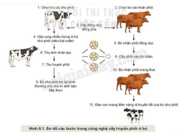Quan sát Hình 6.1, mô tả các bước trong công nghệ cấy truyền phôi ở bò.