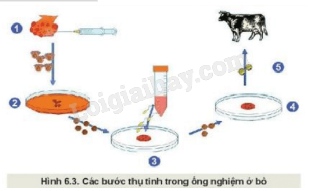 Quan sát Hình 6.3, mô tả các bước thụ tinh trong ống nghiệm ở bò.
