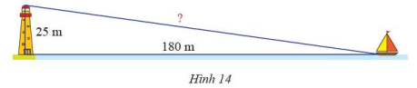 Một con thuyền đang neo ở một điểm cách chân tháp hải đăng \(180\)m. Cho biết tháp hải đăng cao \(25\)m. Hãy tính khoảng cách từ thuyền đến đỉnh tháp hải đăng.