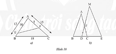 a) Cho tam giác \(ABC\) có \(AB = 12cm,AC = 15cm,BC = 18cm\). Trên cạnh \(AB\), lấy điểm \(E\) sao cho \(AE = 10cm\). Trên cạnh \(AC\), lấy điểm \(F\) sao cho \(AF = 8cm\) (hình 18a). Tính độ dài đoan thẳng \(EF\).