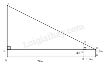 Chiều cao người quan sát là \(CB = 1,5m\); chiều cao cái cọc là \(HF = 3m\); khoảng cách từ người đến cọc là \(HB = 1,2m\); khoảng cách từ tòa nhà đến cọc là \(AH = 27m\). Chiều cao tòa nhà là \(AE\).