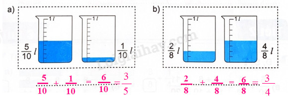 Tính 5/11 + 3/11 Viết phép tính thích hợp để tính tổng số lít nước ở hai bình.