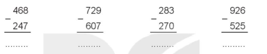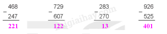 - Thực hiện trừ các chữ số thẳng cột theo thứ tự từ hàng đơn vị đến hàng chục, hàng trăm.