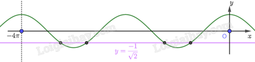 Vẽ đồ thị hàm số \(y = \cos x\), đường thẳng \(y = \frac{{ - 1}}{{\sqrt 2 }}\) và đếm số giao điểm có hoành độ thuộc khoảng \(\left( { - 4\pi ;0} \right)\)