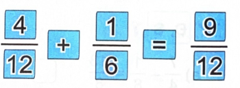 Để được phép tính đúng, Nam cần đổi chỗ 2 tấm thẻ ghi số 4 và 1, khi đó phép tính đúng là:$\frac{1}{{12}} + \frac{4}{6} = \frac{1}{{12}} + \frac{8}{{12}} = \frac{9}{{12}}$