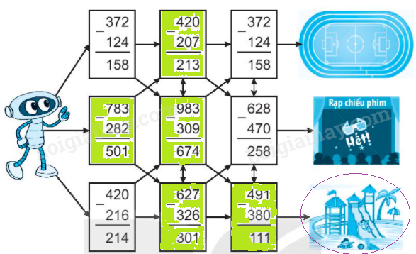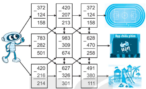 Một hội trường có 450 ghế ngồi. Trong hội trường đã có 235 người, mỗi người ngồi một ghế. Hỏi trong hội trường còn lại bao nhiêu ghế trống? Trong hình sau đây, Rô-bốt sẽ đi theo đường qua các phép tính đúng. Hãy tô màu vào các phép tính đúng và khoanh vào địa điểm mà Rô-bốt sẽ đến.