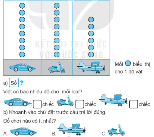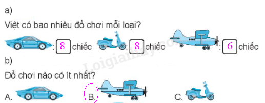 b) So sánh rồi khoanh trước đáp án ghi đồ chơi có ít nhất.