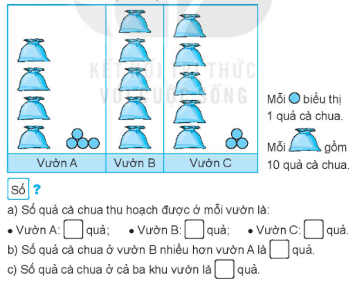 a) Quan sát tranh em tính số quả cà chua ở mỗi vườn rồi viết số thích hợp vào chỗ chấm.
