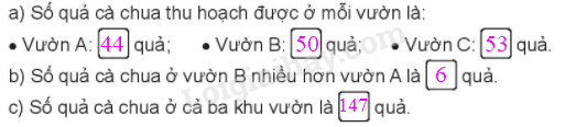 b) Số quả cà chua ở vườn B nhiều hơn vườn A = Số quả cà chua ở vườn B - số cà chua ở vườn A.