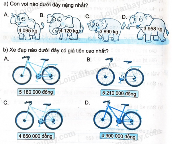 So sánh các cân nặng của các con voi, giá tiền của những chiếc xe đạp để trả lời câu hỏi