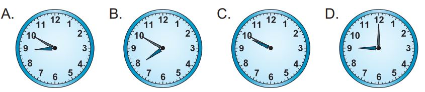 d) Rô-bốt nướng bánh trong 20 phút. Bánh nướng xong lúc 9 giờ 25 phút. Hỏi đồng hồ nào dưới đây chỉ lúc Rô-bốt bắt đầu nướng bánh?