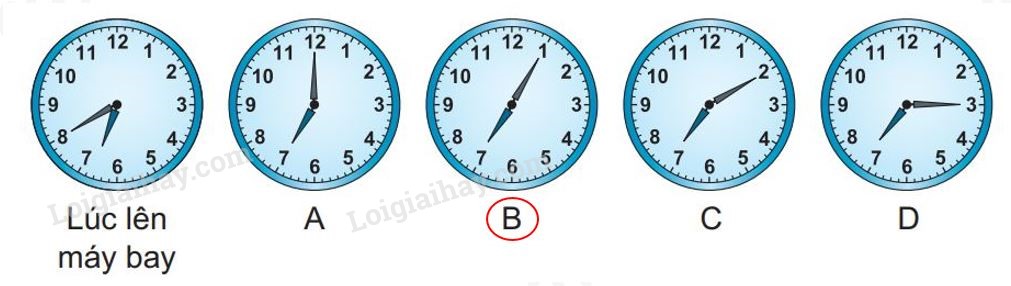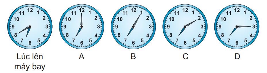 Tìm thời gian máy bay cất cánh rồi chọn đồng hồ thích hợp.
